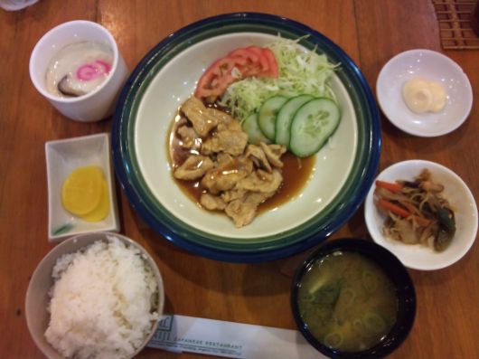 ある日本食レストラン写真は豚生姜焼き定食茶碗蒸しまで付いてP230込み込み価格で美味しい。